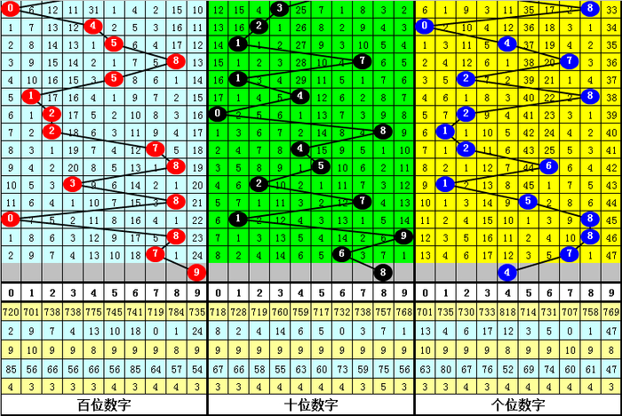 百位走势:近10期在0-8之间出号,跨度为9点,出号相比踱步,上期奖号为7,下跌1点,本期看好该位高潮。另外近10期该位大小比为5:5,均衡,本期预测出现大号,热心号码9。
